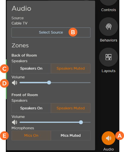 When an audio processor is added to an Activity, its associated sources and zones can be controlled in the Activity Interface. Note that, in the image below, there are two defined zones in the Activity. Both zones have Speakers On/Speakers Muted and volume slider controls, while one zone ("Front of Room") contains microphones, and thus has Mics On/Mics Muted controls.