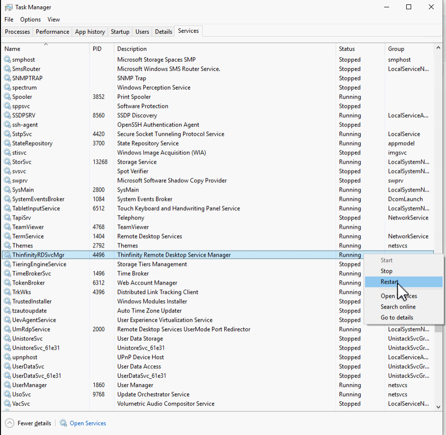 Step 3: Launch the Task Manager and restart the Thinfinity Remote Desktop Service Manager from the Services Tab:
