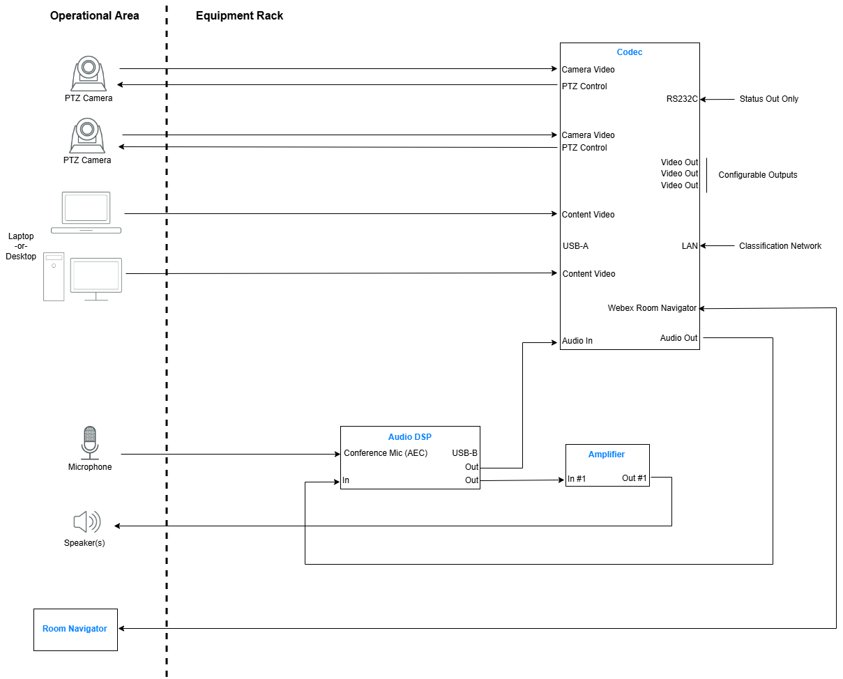 Note that a Cisco CODEC cannot be controlled by its RS232C interface. External control can only be accomplished through USB. Unfortunately, not all needed functions are exposed through the USB interface. A workaround for this is to incorporate a Cisco Room Navigator for control and an external DSP for audio.