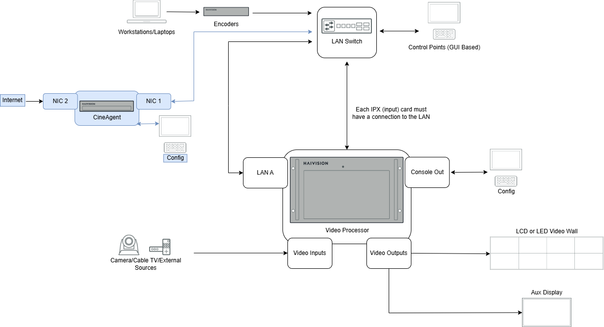 The video processor also needs a keyboard, mouse and display for initial configuration and future updates. If the end user will be frequently changing URLs, consider locating the CineAgents in an operational area or mount them in the equipment rack and extend control with a KVM extender.