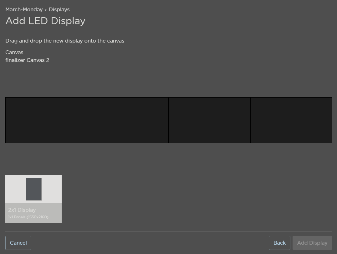 Once the display is added to the Canvas, it appears in orange as allocated space. The Add Display button is now enabled, and the connected display in the bottom left corner is no longer available.