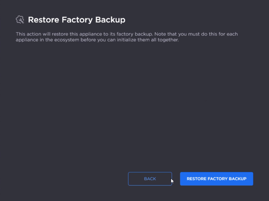 As noted in the interface, each appliance in the environment must be restored to its factory backup before you can initialize them together.