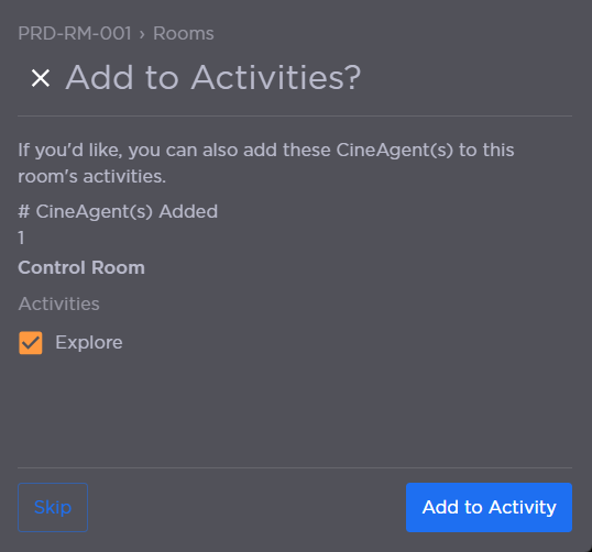 If Activities exist and are already associated with the Room, the option appears to add the CineAgent to an Activity. If desired, check the box for the Activity and click Add to Activity. Otherwise, click Skip.