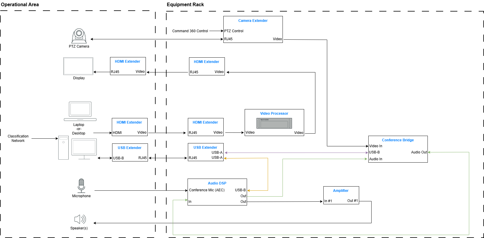 Not shown in the figure below for reasons of simplicity are AV LAN connections to the Video Processor, the Audio DSP, and the Conference Bridge. Commands sent to the Camera Extender for PTZ (pan, tilt, & zoom) control are mostly sent via RS-232C, so a Global Cache or similar interface would be used.