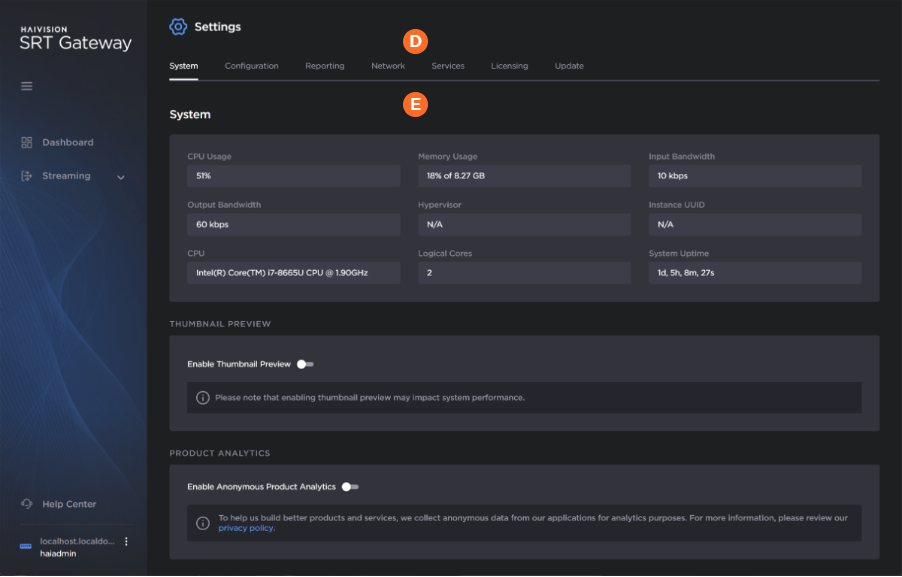 | Hostname and Current User | Identifies your gateway by the configured hostname and the user who is currently signed into the system. You may change the hostname in the Settings > Network page. See Configuring the Network for details. |