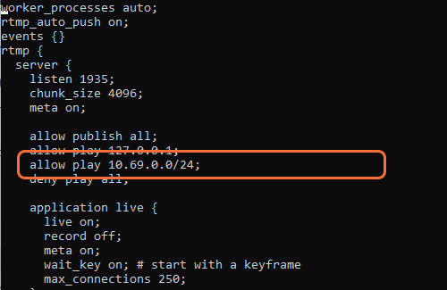 /opt/haivision/madra/conf/nginx/nginx-rtmp.confwith the desired IP range used in the line starting with 'allow play'.