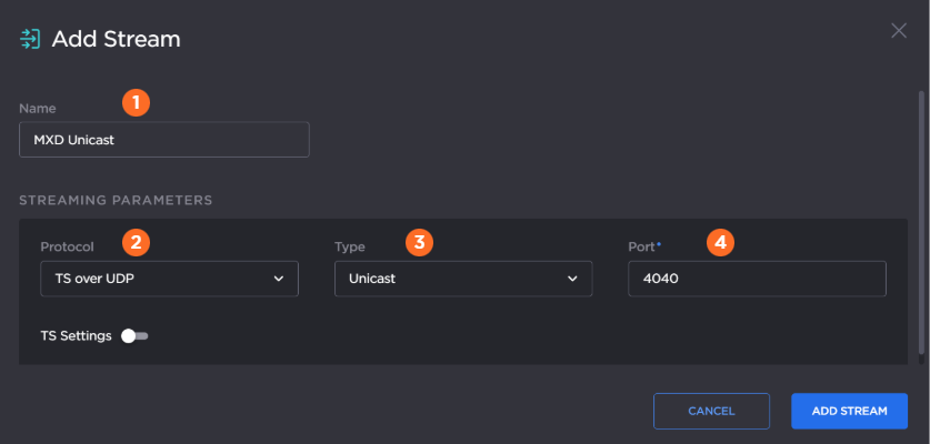 protocol.For this example, we are using unicast TS over UDP. So, you need to include the
