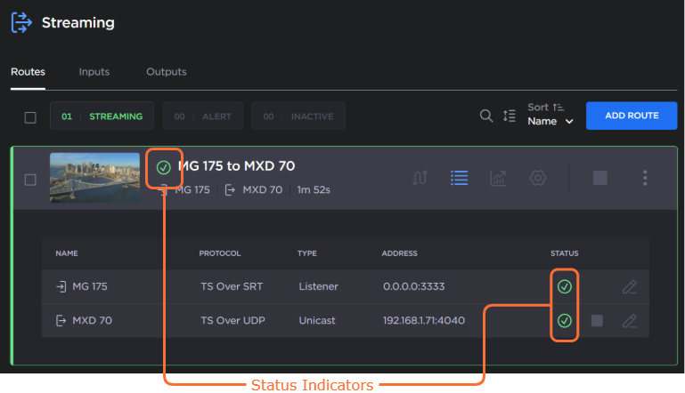 To ensure that everything is set up properly, verify that the streams have green status indicators on each device.