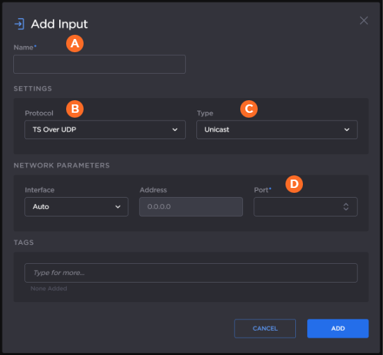 Enter an Input Name, select TS over UDP for the Protocol (for this example), and enter the port number of the source Makito X4 Encoder (see Step #10 in Setting Up a Makito Source Stream).
