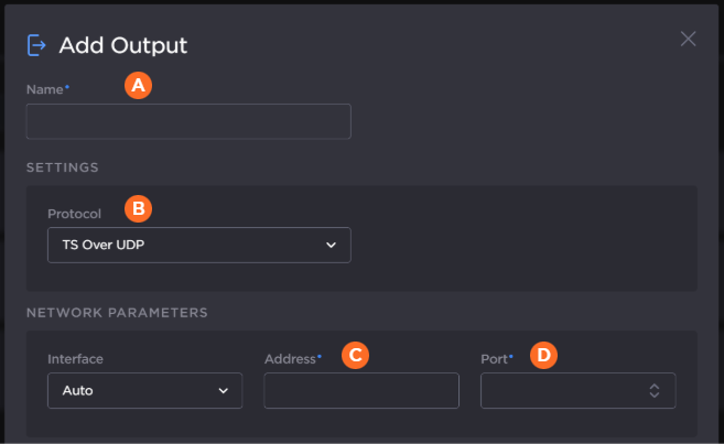 In the Add Output dialog, provide an output name, select TS over UDP for the protocol, and enter the IP Address and port number of the destination Makito X4 Decoder (see Step #4 in Setting Up a Makito Destination).