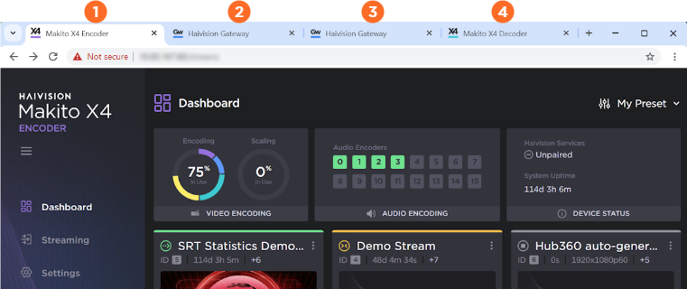 Use the tabs in one browser to point to the URL of each workflow element to create a workspace. For example, access the Makito X4 web interface of your source on one tab, the cloud Media Gateway/SRT Gateway on another, and so forth. This way, you can switch back and forth between them.