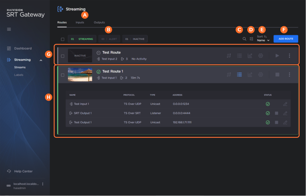 | The route/inputs/outputs status buttons (streaming/active, alert, or inactive) can be used to filter the route/inputs/outputs list. |