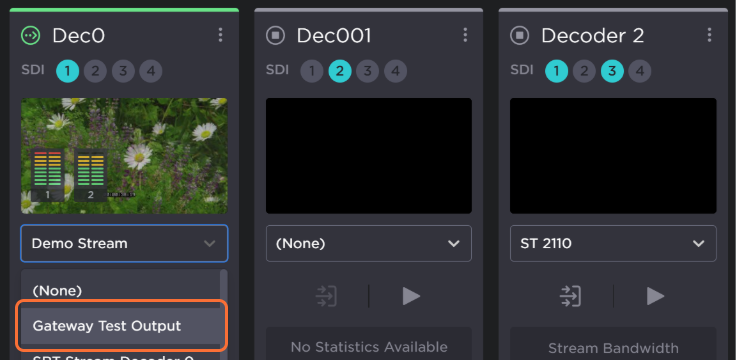 In the sidebar, click Dashboard. To configure the SDI1 output with the stream, click the dropdown in the decoder assigned to SDI Output 1, and choose the stream you created in Step #4 from the list.