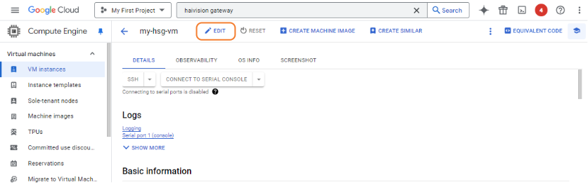 To add the SSH public key to the instance, go to the VM details page and click the Edit button.