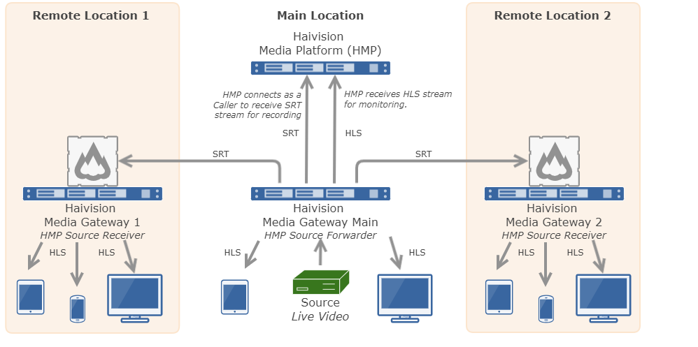 After the live session is initiated, the video automatically streams to and is viewable by the audience at all locations (as shown in the following diagram):