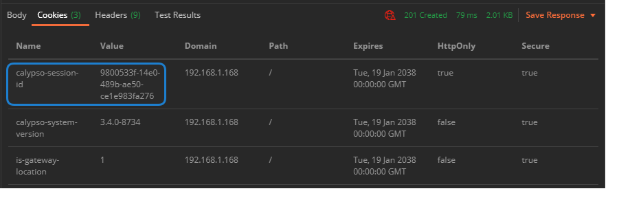 If successful, a session cookie is returned in the request. Click the Cookies tab to see the response.