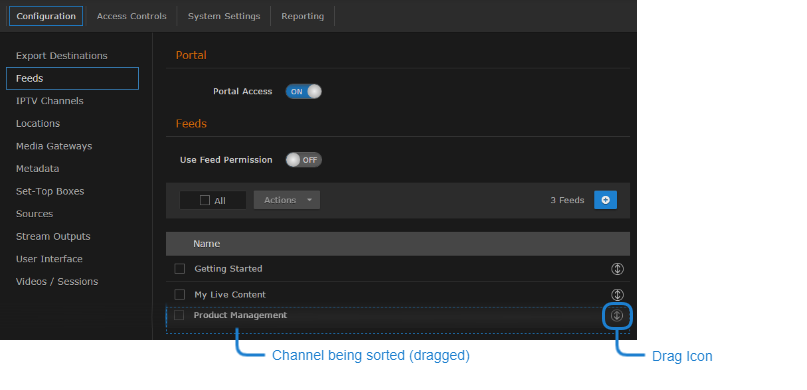 The Portal option is added to the navigation bar when not on the Administration screen.To allow Feed permissions to take precedence over the Access Permissions assigned to individual videos, sessions, or sources, toggle the Use Feed Permission button to On.
