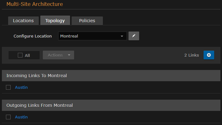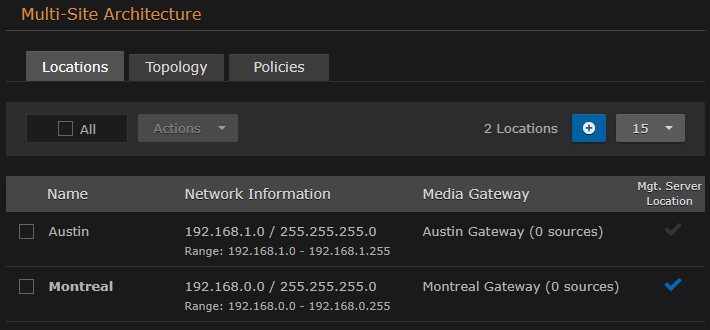 From the above example, the two locations are created with appropriate IP address and mask defined for each and the Montreal location is set as the Mgt. Server Location.On the HMP Topology list, configure the network topology of your locations; that is, the incoming and outgoing connections for each location. For the example shown above, the locations have incoming and outgoing source links to each other.