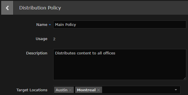 On the HMP Policies list, create a distribution policy in accordance with your network. If you wish to limit the propagation of sources to specific locations, create multiple policies and limit the Target Locations field in each. For this example, all sources are propagated to each location.