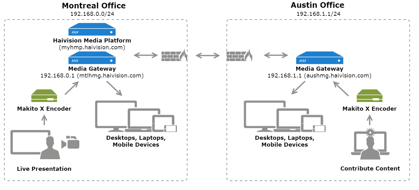 Haivision Media Platform works with Media Gateway to support live video distribution across a multi-site environment. This section discusses how to integrate the Media Gateway into HMP for extending the reach of your video network. After a Media Gateway and HMP are configured properly, the system ensures that both live and on-demand video is available to users based on their location on your network and that bandwidth consumption is minimized between network hops.