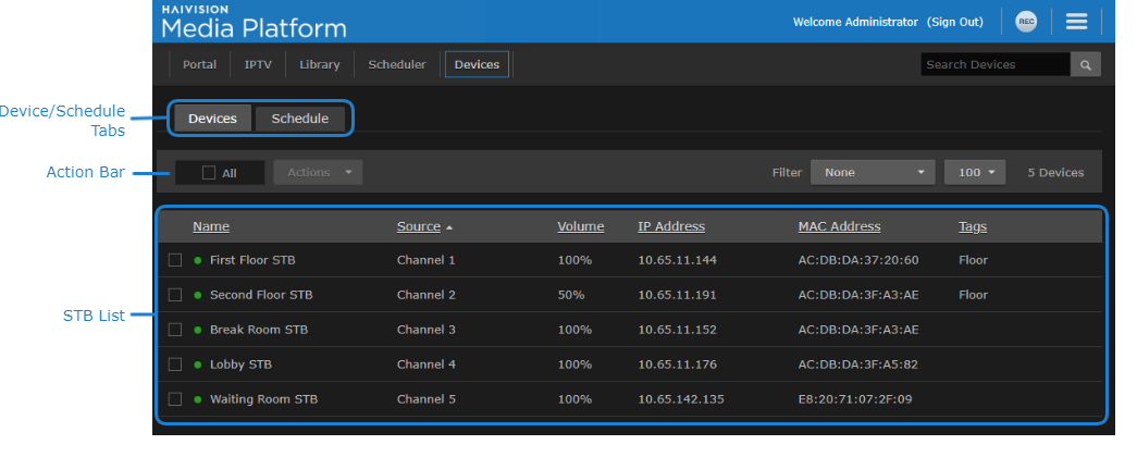 To get started with managing your connected Haivision Play Set-Top Boxes, see Managing and Scheduling Devices.