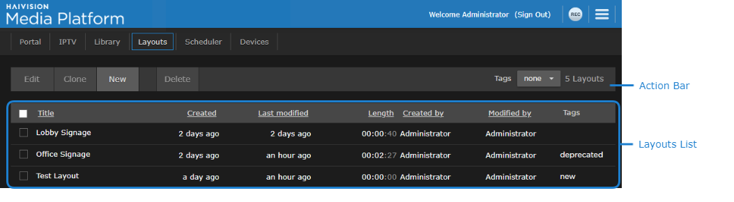 If your system is licensed for Layouts and your account has the View Layout permission, the Layouts screen allows you to manage the available layouts on the HMP system.