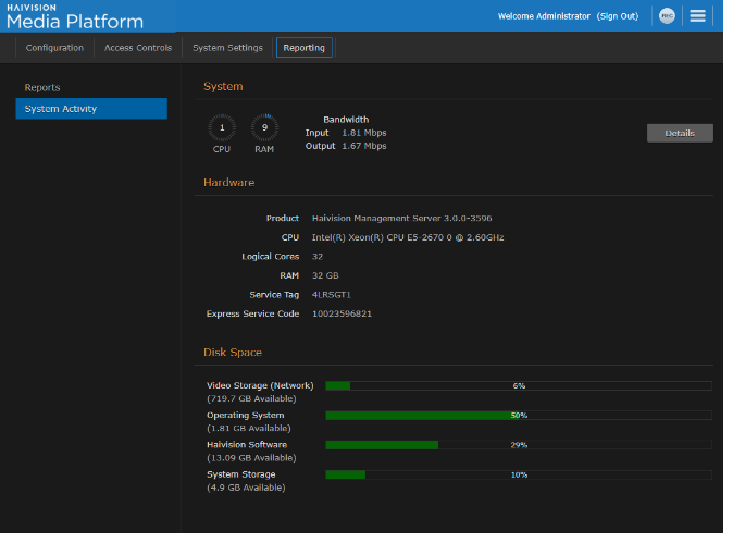 The available space for (local) video storage, operating system, Haivision software, and system storage (in GBs available, as well as percent used).