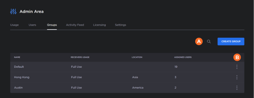 The Groups tab allows admins to create, delete, and manage groups.