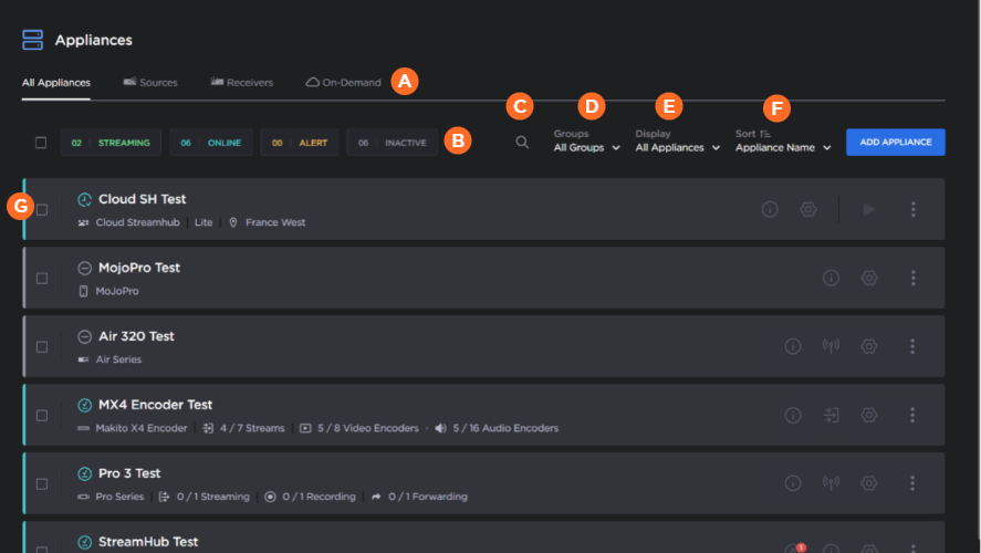 The Appliances screen allows you to manage and control your connected Haivision devices (encoders, decoders, transmitters, and receivers).