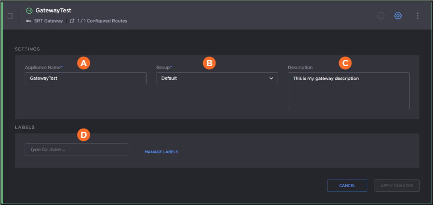 | Labels | Allows you to attach labels to your appliance for easier filtering of the appliance list. See Managing Appliance Labels for details on creating and editing labels and applying labels to an appliance. |