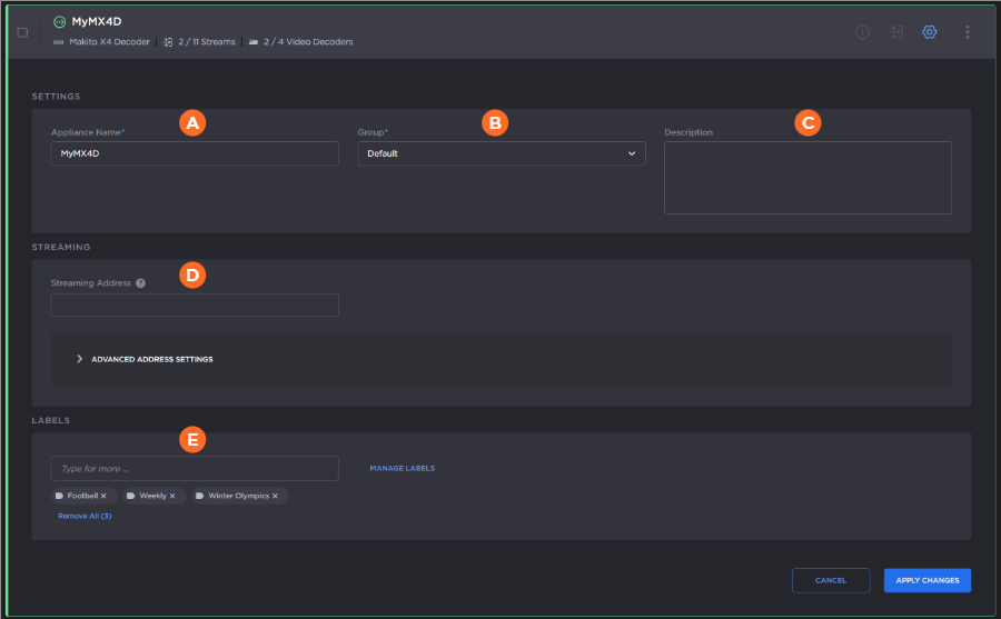| Streaming Address | (Makito Decoders only) Specifies a custom address or domain name for video streams instead of the existing appliance address. This address or domain will be used by Hub 360 to create video routes and transmissions to this Makito Decoder.