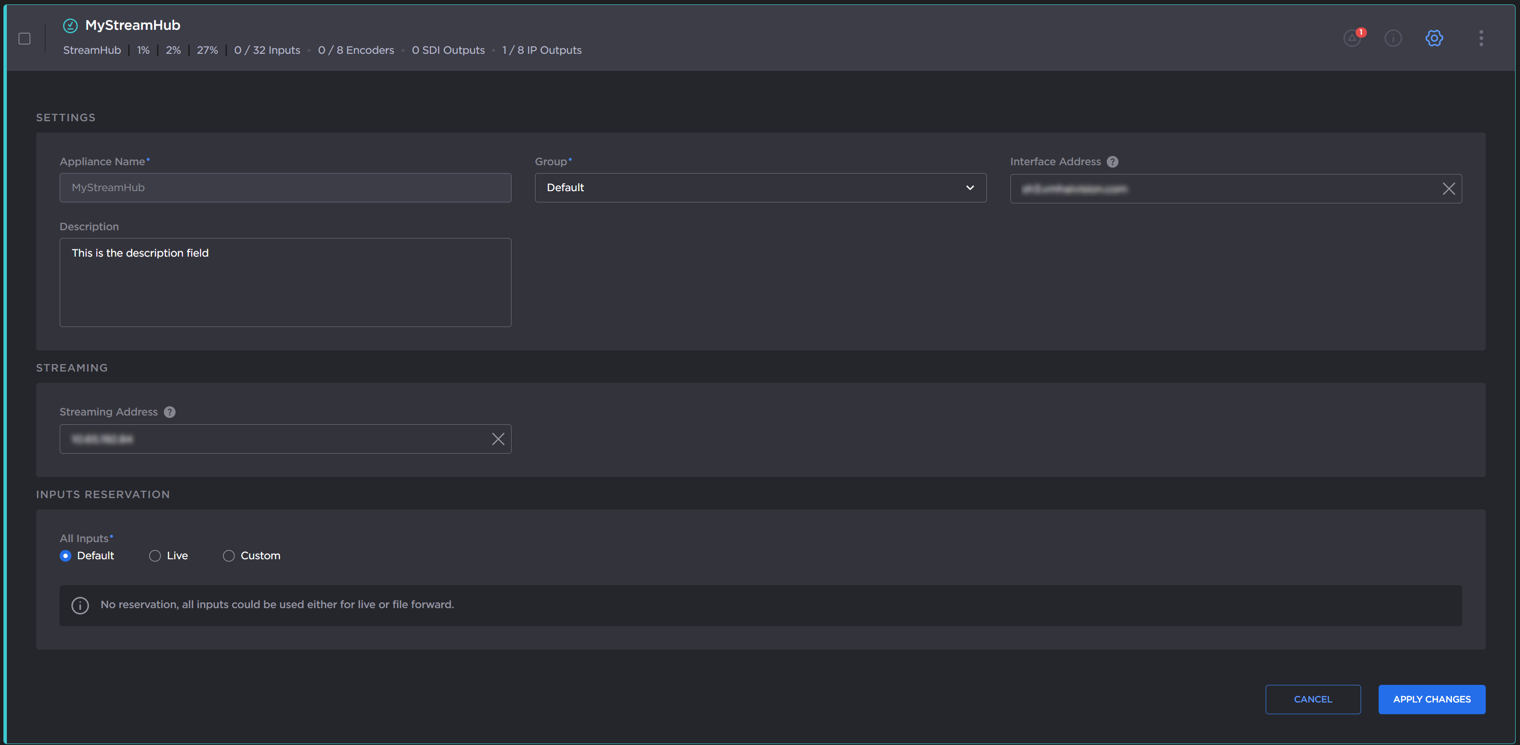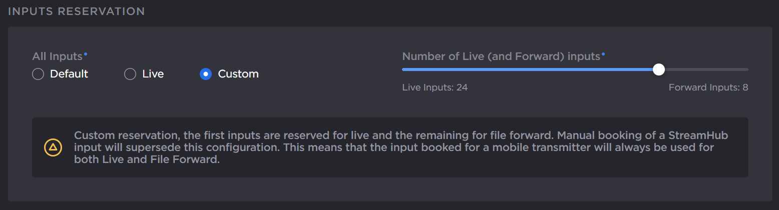 For each of your StreamHubs (cloud and on-premise), you may decide how many inputs you wish to reserve for lives and file forwards.