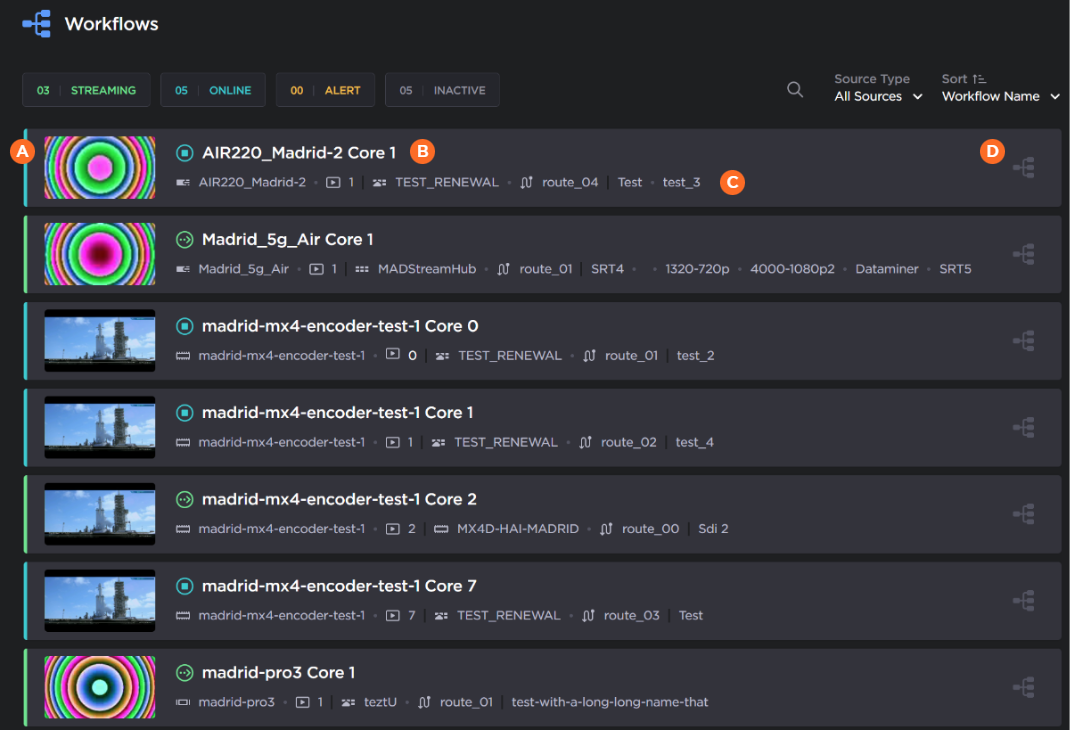 To open the Workflows screen, click Workflows in the sidebar. A listing of all currently streaming and booked routes is shown: