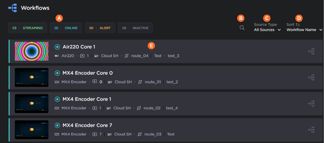 | The route status buttons (streaming, online, alert or inactive) can be used to filter the workflows list. |