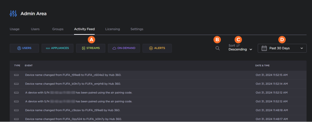 The Usage tab shows various statistics allowing you to monitor your organization's usage within Hub 360. Each tile provides you with various information about your organization, including the number of paired appliances and Cloud StreamHub usage. See Monitoring Your Organization's Usage for more details.