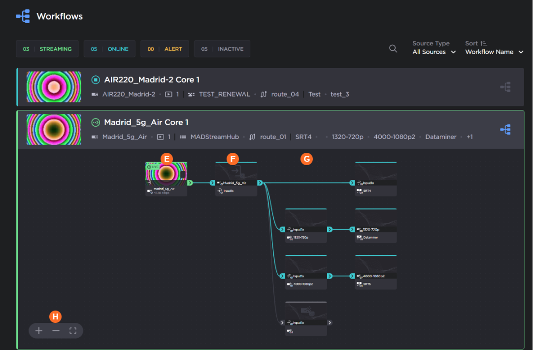 The Workflows section of Haivision Hub 360 allows you to view all streaming and booked routes created in Hub 360. By expanding each route you can view a graphical representation of the flow of your video streams through your connected appliances.