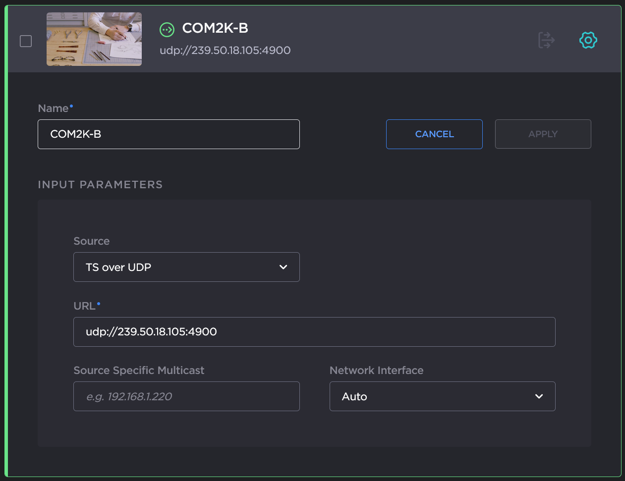 For transcoding, select either TS over UDP (default), TS over SRT, TS over TCP, RTSP, Raw Motion JPEG (MJPEG), or RTMP. For configuration details, see Input Settings.