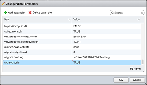 Adding svga.vgaonly = "TRUE" as a configuration parameter improves stability for Kraken instances with GPU passthrough enabled.
