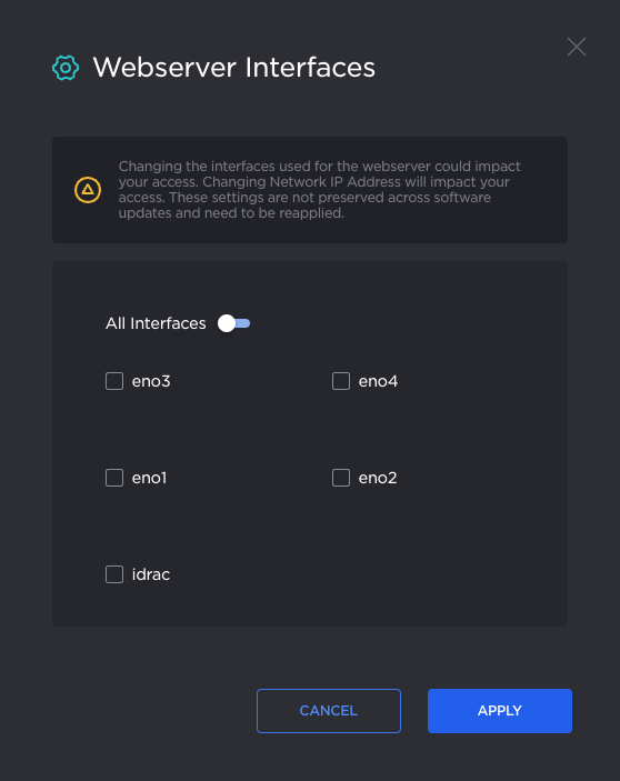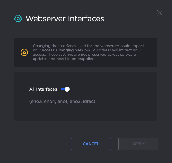 To select which network interfaces allow access to the Kraken Web and API interface, click the Settings icon . The interface selection panel opens, as in the example below.