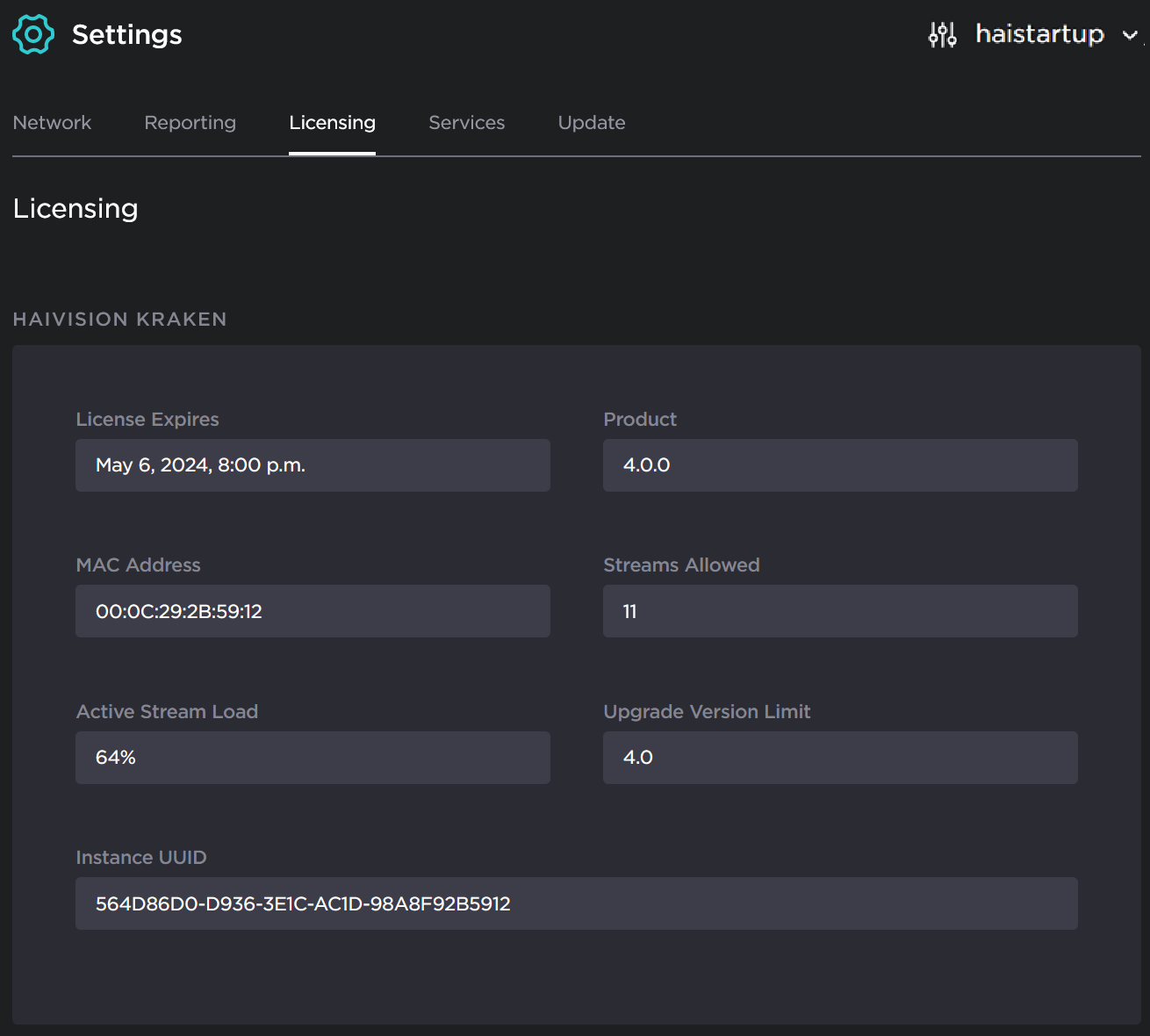 The Licensing page provides two pieces of information required to generate the license:MAC Address