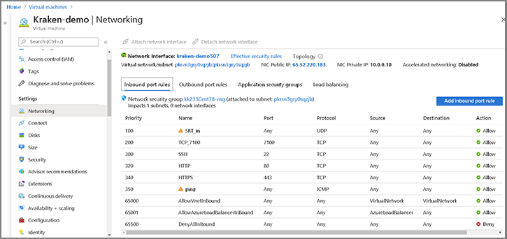 By default, most Inbound and Outbound network traffic ports are denied. To allow Kraken input and output streams to get in and out the VM machine, you need to add inbound/outbound rules to open some ports for certain protocols. For example, SRT needs some ports opened for UDP. Also, customized rules should be higher priority than default deny-rules. Example setups are shown following (ports can be narrowed down to a range too).
