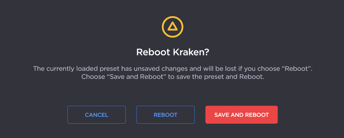 If Autosave was disabled and you did not save your existing preset configuration, you will receive a warning on the reboot panel.