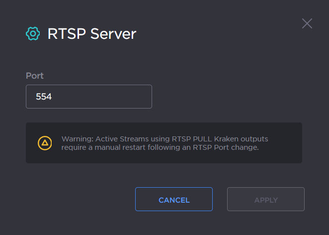 If you have active streams using RTSP pull outputs, you must manually restart the Kraken to apply the RTSP port change.