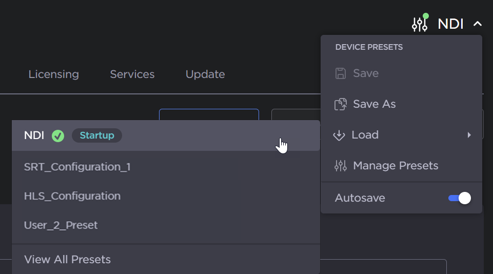 PresetAutosaveis enabled by default on new installations. This feature is designed to help users who have not saved their configurations into presets, to prevent loss of configuration settings when signing out, rebooting, or if the power is disconnected on their units.If you disable the presetAutosave, you will have to manually save your preset configurations.