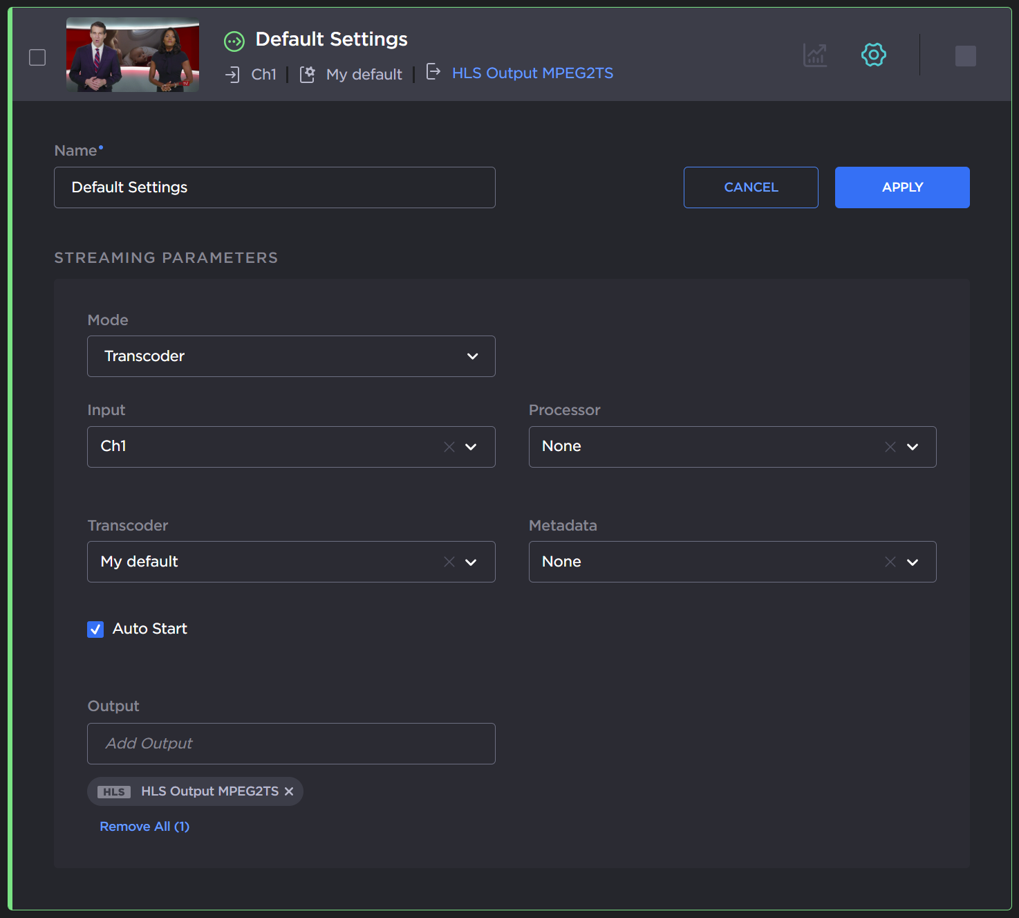 The Inputs, Transcoders, Outputs, and Metadata sources that you have previously defined will be selectable when you add or modify a stream.