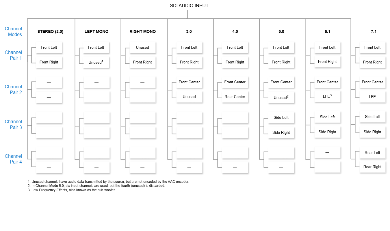 Audio Channel LayoutsIn order to ensure that your audio is processed properly, the audio channels in the upstream source should be configured as follows for each Channel Mode: = Note Generally, the encoder can process intelligible audio as long as each channel pair value is found in the channel mode, regardless of positioning. The exception to this is LFE (Low-Frequency Effects, also known as the sub-woofer). The LFE must be the fourth channel in the input channel set, and the last audio object in the AAC elementary stream access unit when it is present (i.e. in modes 5.1 and 7.1) in order to produce intelligible audio. | ||