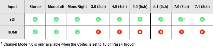 AC3 & E-AC3 AudioWhen passing through encoded AC3 or E-AC3 audio, the Channel Mode will determine what audio data is passed through, which varies based on the SMPTE 337 encapsulation mode used in the upstream source. These encapsulation modes can hold PCM Audio, non-PCM audio, or a combination of both. To prioritize AC3/E-AC3 (i.e. non-PCM audio) select the appropriate channel mode according to the table below. | ||
