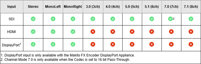 Audio Channels | The MFX supports audio encoding of up to 4 stereo pairs (8 channels). |