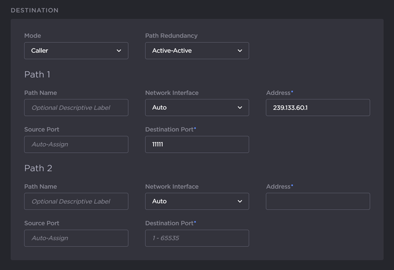 Select either Active-Active or Active-Backup for Path Redundancy and fill in the Destination Parameters for each path. See Stream Settings ("SRT Settings" tab).
