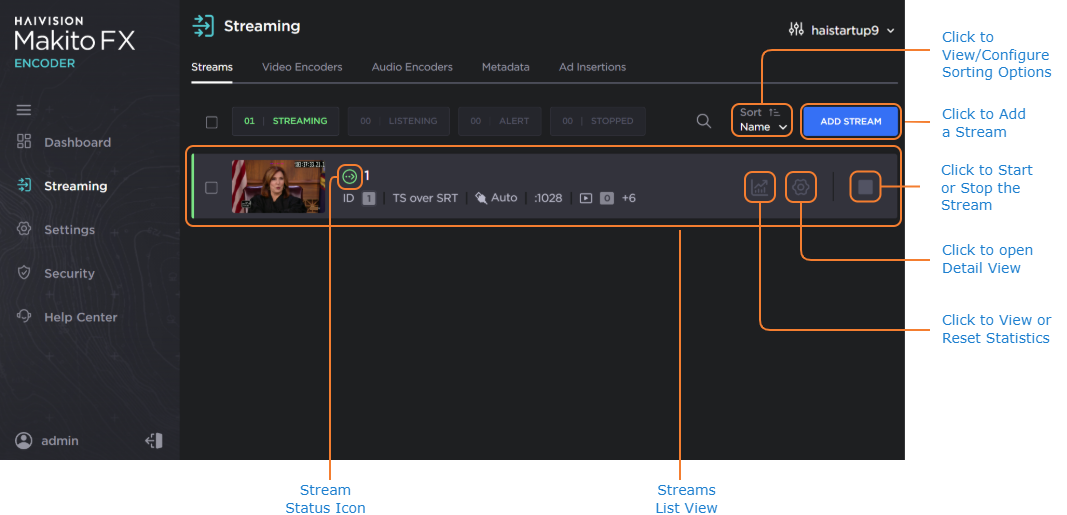 The Stream Status is color coded, and the Stream State is indicated by the State icon.